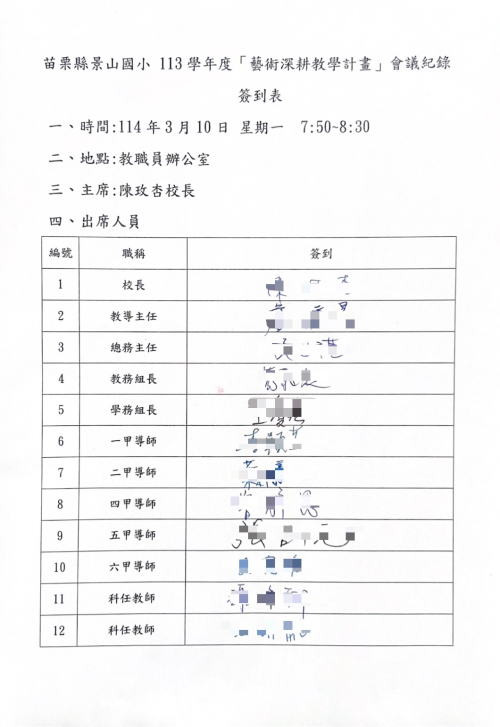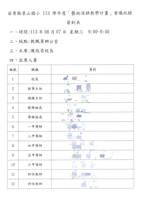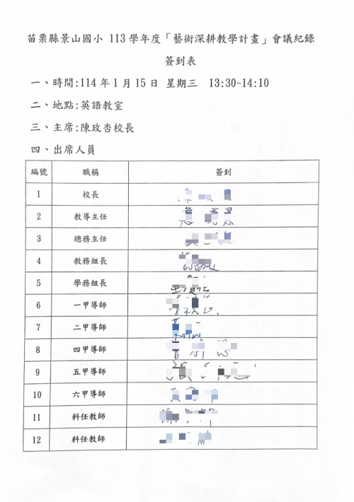 苗栗縣卓蘭鎮景山國民小學113學年度「藝術深耕教學計畫」期末工作小組定期會議紀錄