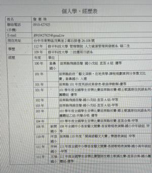 (1)最高學歷: 修平科技大學 管理學院 人力資源管理與發展系 碩二生